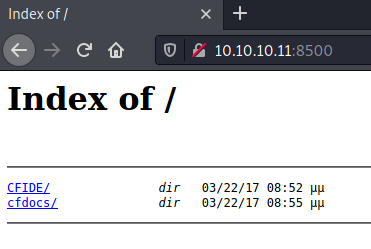 The port 8500 is running FMTP. It takes about 20-30 seconds to perform every request, so we have to wait a little bit before seeing two folders: CFIDE and cfdocs.
