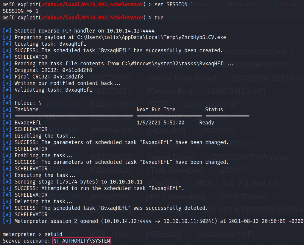 We can use exploit/windows/local/ms10_092_schelevator to escalate and get SYSTEM: