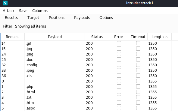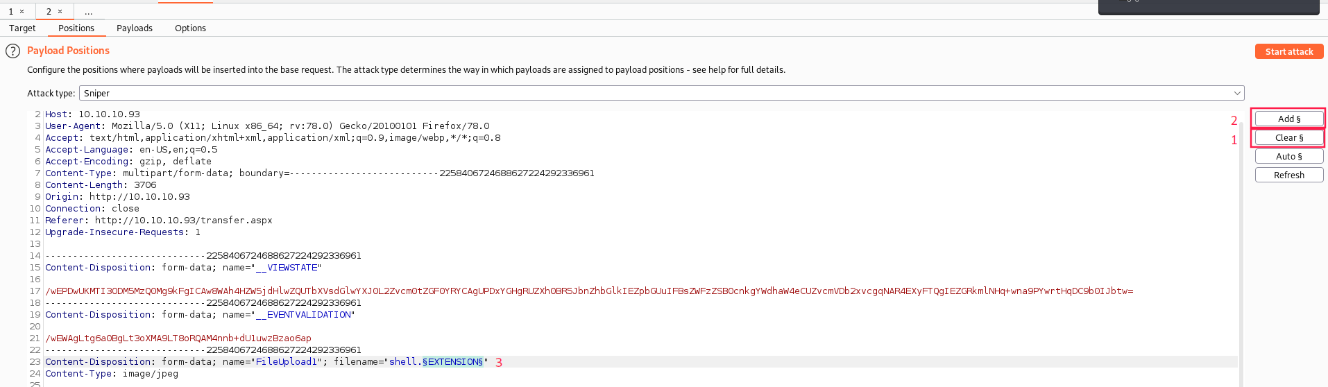 In order to figure out which extensions are allowed on this web server, we’ll be using Burp Intruder. Here are the steps: