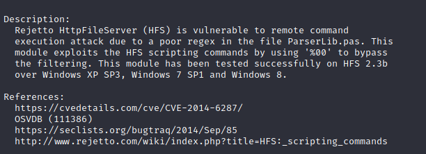 First, since our nmap scan identified that the target is running HttpFileServer (HFS) version 2.3, and considering that gobuster didn’t find any thing, let’s search for exploits: