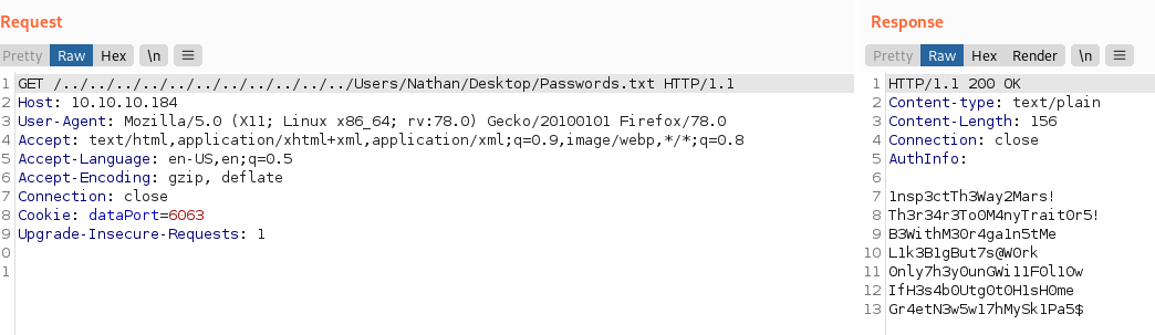 Now as we saw while enumerating FTP, there is a Passwords.txt file in Nathan’s Desktop: