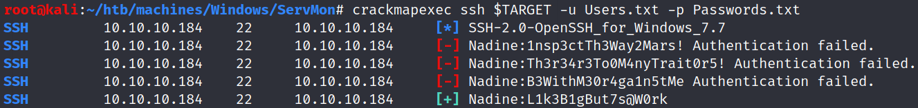 $ crackmapexec smb $TARGET -u Users.txt -p Passwords.txt