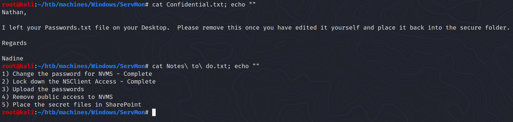 According to these files, there is a Passwords.txt inside Nathan’s Desktop and an application called NVMS offers a public access while they plan to remove it.