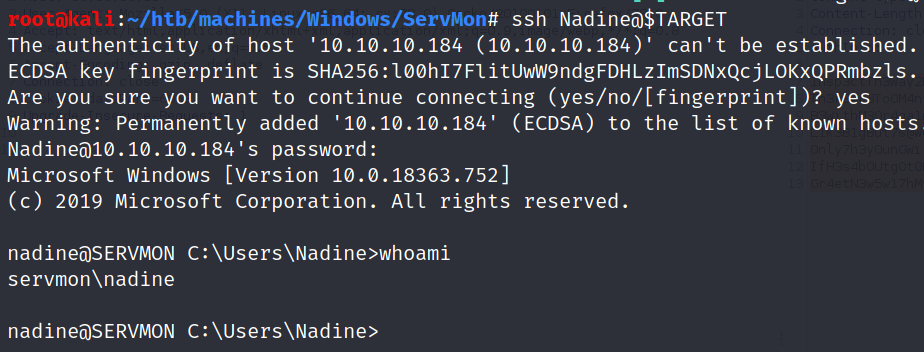 Nadine’s password L1k3B1gBut7s@W0rk works for both SSH and SMB. Let’s get a shell: