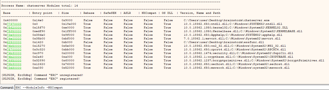 Base | Entry point | Size | Rebase | SafeSEH | ASLR | NXCompat | OS DLL | Version, Name, and Path