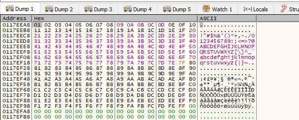 We can also use a plugin called ERC.Xdbg to compare the dump with an array of bytes containing all characters.