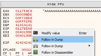 To analyze our payload in the program’s memory within x32dbg, we could rely only on our eyes by right-clicking on ESP and selecting Follow in Dump or Follow in Stack.