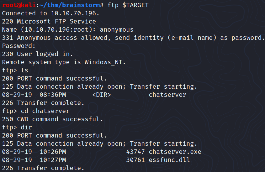 We can login anonymously with ftp. As we can see there is a folder called chatserver which contains two files: