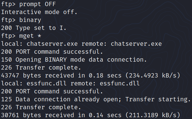At this point, I downloaded the two files using put <filename>. Then I tried to run chatserver.exe with wine but it didn’t worked. I also tried to execute it from a Windows VM.