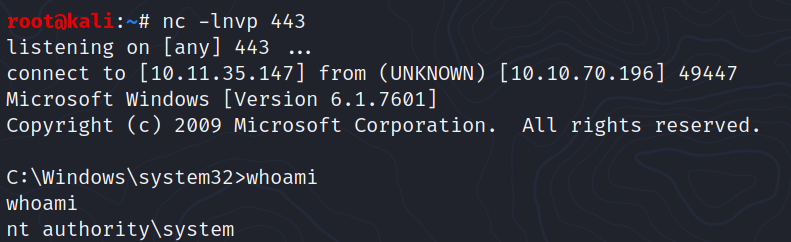 Now we have to replace the IP address of the target, we execute our script again and we got a shell as system: