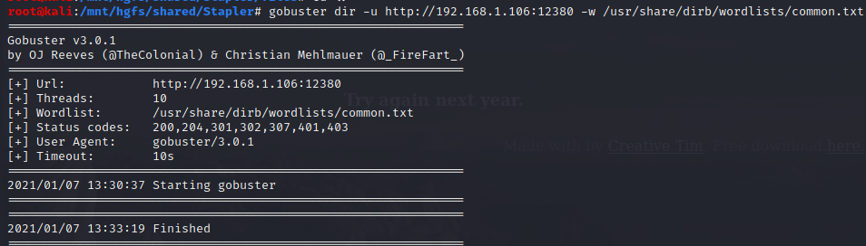 $ gobuster dir -u https://192.168.1.106:12380 -w /usr/share/dirb/wordlists/common.txt -o services/12380-https.txt -k -t 4